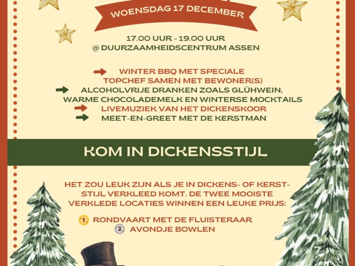 Vrijdag 17 december van 17.00-19.00 uur is het weer zover: We gaan met een hapje en een drankje het jaar afsluiten tijdens het jaarlijkse kerstfestijn voor bewoners, medewerkers, vrijwilligers en nog meer mensen die betrokken zijn bij Phusis. Dit jaar is het kerstfestijn in het Duurzaamheidscentrum in Assen. Naast de ontvangst van de kerstman hebben we ook het Dickens-koor Advendo. Dit is